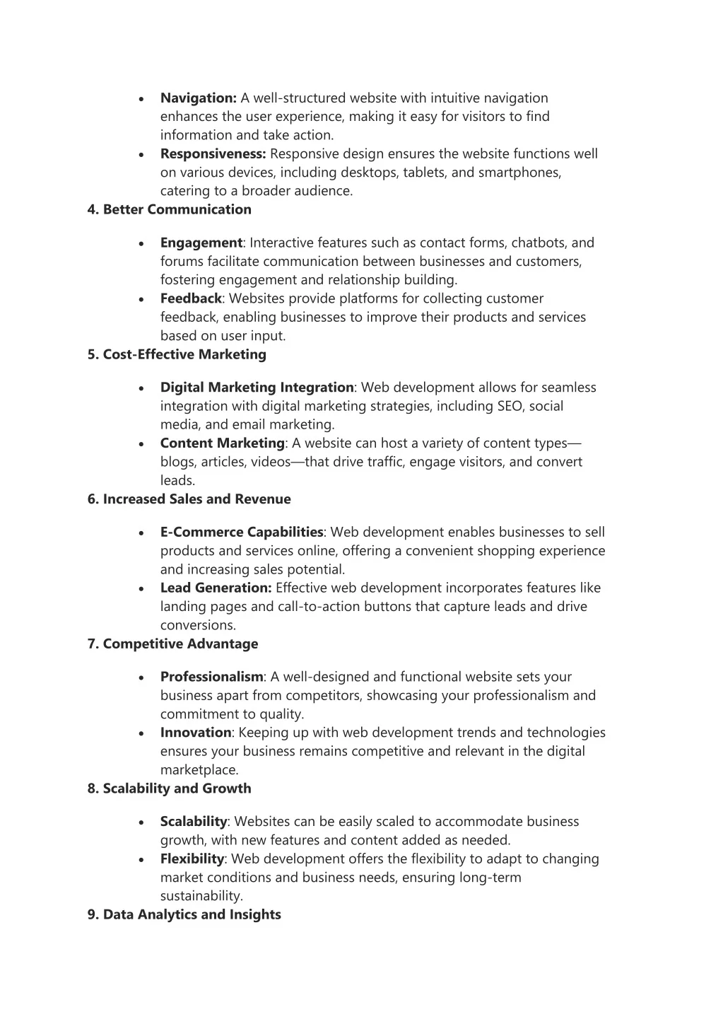 Navigation: A well-structured website with intuitive navigation enhances the user experience, making it easy for visitors to find information and take action. Responsiveness: Responsive design ensures the website functions well on various devices, including desktops, tablets, and smartphones, catering to a broader audience. 4. Better Communication • • Engagement: Interactive features such as contact forms, chatbots, and forums facilitate communication between businesses and customers, fostering engagement and relationship building. Feedback: Websites provide platforms for collecting customer feedback, enabling businesses to improve their products and services based on user input. 5. Cost-Effective Marketing • • Digital Marketing Integration: Web development allows for seamless integration with digital marketing strategies, including SEO, social media, and email marketing. Content Marketing: A website can host a variety of content types— blogs, articles, videos—that drive traffic, engage visitors, and convert leads. 6. Increased Sales and Revenue • • E-Commerce Capabilities: Web development enables businesses to sell products and services online, offering a convenient shopping experience and increasing sales potential. Lead Generation: Effective web development incorporates features like landing pages and call-to-action buttons that capture leads and drive conversions. 7. Competitive Advantage • • Professionalism: A well-designed and functional website sets your business apart from competitors, showcasing your professionalism and commitment to quality. Innovation: Keeping up with web development trends and technologies ensures your business remains competitive and relevant in the digital marketplace. 8. Scalability and Growth • • Scalability: Websites can be easily scaled to accommodate business growth, with new features and content added as needed. Flexibility: Web development offers the flexibility to adapt to changing market conditions and business needs, ensuring long-term sustainability. 9. Data Analytics and Insights • •