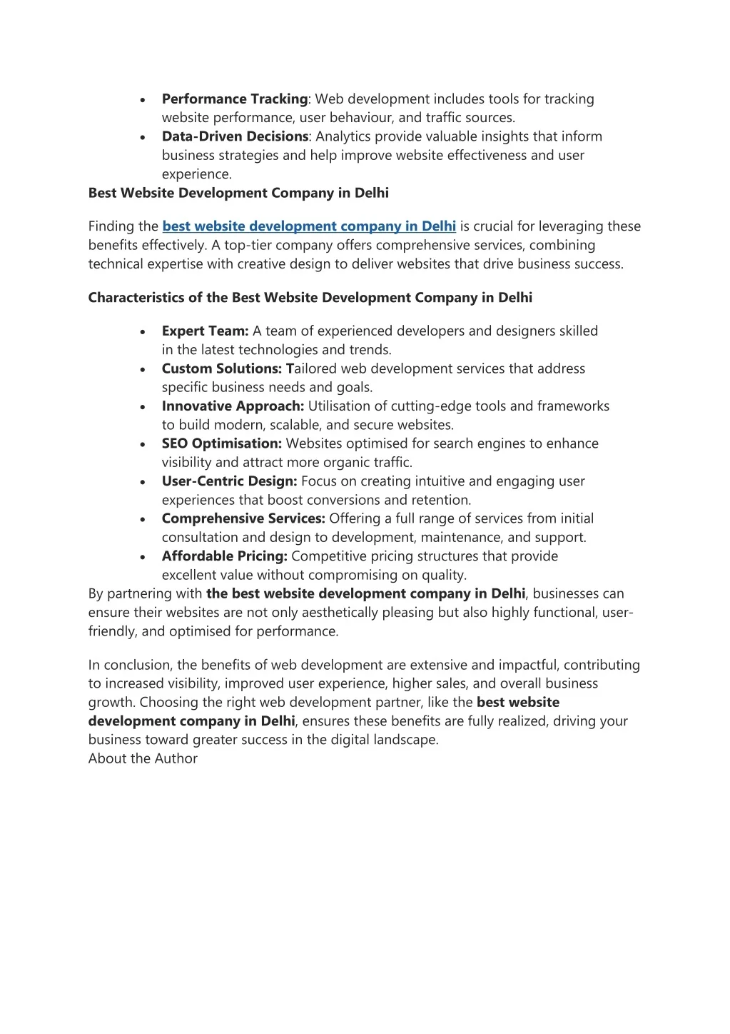 Performance Tracking: Web development includes tools for tracking website performance, user behaviour, and traffic sources. Data-Driven Decisions: Analytics provide valuable insights that inform business strategies and help improve website effectiveness and user experience. Best Website Development Company in Delhi • • Finding the best website development company in Delhi is crucial for leveraging these benefits effectively. A top-tier company offers comprehensive services, combining technical expertise with creative design to deliver websites that drive business success. Characteristics of the Best Website Development Company in Delhi Expert Team: A team of experienced developers and designers skilled in the latest technologies and trends. Custom Solutions: Tailored web development services that address specific business needs and goals. Innovative Approach: Utilisation of cutting-edge tools and frameworks to build modern, scalable, and secure websites. SEO Optimisation: Websites optimised for search engines to enhance visibility and attract more organic traffic. User-Centric Design: Focus on creating intuitive and engaging user experiences that boost conversions and retention. Comprehensive Services: Offering a full range of services from initial consultation and design to development, maintenance, and support. Affordable Pricing: Competitive pricing structures that provide excellent value without compromising on quality. By partnering with the best website development company in Delhi, businesses can ensure their websites are not only aesthetically pleasing but also highly functional, user- friendly, and optimised for performance. • • • • • • • In conclusion, the benefits of web development are extensive and impactful, contributing to increased visibility, improved user experience, higher sales, and overall business growth. Choosing the right web development partner, like the best website development company in Delhi, ensures these benefits are fully realized, driving your business toward greater success in the digital landscape. About the Author