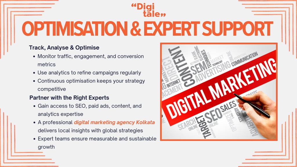 OPTIMISATION & EXPERT SUPPORT Track, Analyse & Optimise Monitor traffic, engagement, and conversion metrics Use analytics to refine campaigns regularly Continuous optimisation keeps your strategy competitive Partner with the Right Experts Gain access to SEO, paid ads, content, and analytics expertise A professional digital marketing agency Kolkata delivers local insights with global strategies Expert teams ensure measurable and sustainable growth