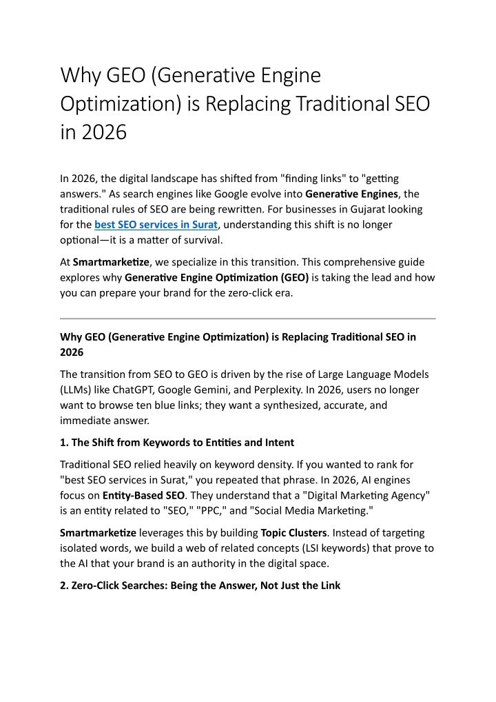 Why GEO (Generative Engine Optimization) is Replacing Traditional SEO in 2026 In 2026, the digital landscape has shifted from "finding links" to "getting answers." As search engines like Google evolve into Generative Engines, the traditional rules of SEO are being rewritten. For businesses in Gujarat looking for the best SEO services in Surat, understanding this shift is no longer optional—it is a matter of survival. At Smartmarketize, we specialize in this transition. This comprehensive guide explores why Generative Engine Optimization (GEO) is taking the lead and how you can prepare your brand for the zero-click era. Why GEO (Generative Engine Optimization) is Replacing Traditional SEO in 2026 The transition from SEO to GEO is driven by the rise of Large Language Models (LLMs) like ChatGPT, Google Gemini, and Perplexity. In 2026, users no longer want to browse ten blue links; they want a synthesized, accurate, and immediate answer. 1. The Shift from Keywords to Entities and Intent Traditional SEO relied heavily on keyword density. If you wanted to rank for "best SEO services in Surat," you repeated that phrase. In 2026, AI engines focus on Entity-Based SEO. They understand that a "Digital Marketing Agency" is an entity related to "SEO," "PPC," and "Social Media Marketing." Smartmarketize leverages this by building Topic Clusters. Instead of targeting isolated words, we build a web of related concepts (LSI keywords) that prove to the AI that your brand is an authority in the digital space. 2. Zero-Click Searches: Being the Answer, Not Just the Link