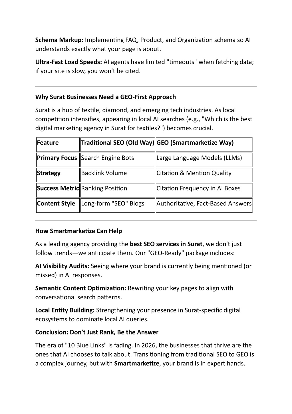 Schema Markup: Implementing FAQ, Product, and Organization schema so AI understands exactly what your page is about. Ultra-Fast Load Speeds: AI agents have limited "timeouts" when fetching data; if your site is slow, you won't be cited. Why Surat Businesses Need a GEO-First Approach Surat is a hub of textile, diamond, and emerging tech industries. As local competition intensifies, appearing in local AI searches (e.g., "Which is the best digital marketing agency in Surat for textiles?") becomes crucial. Feature Traditional SEO (Old Way)GEO (Smartmarketize Way) Primary FocusSearch Engine Bots Large Language Models (LLMs) Strategy Backlink Volume Citation & Mention Quality Success MetricRanking Position Citation Frequency in AI Boxes Content StyleLong-form "SEO" Blogs Authoritative, Fact-Based Answers How Smartmarketize Can Help As a leading agency providing the best SEO services in Surat, we don't just follow trends—we anticipate them. Our "GEO-Ready" package includes: AI Visibility Audits: Seeing where your brand is currently being mentioned (or missed) in AI responses. Semantic Content Optimization: Rewriting your key pages to align with conversational search patterns. Local Entity Building: Strengthening your presence in Surat-specific digital ecosystems to dominate local AI queries. Conclusion: Don't Just Rank, Be the Answer The era of "10 Blue Links" is fading. In 2026, the businesses that thrive are the ones that AI chooses to talk about. Transitioning from traditional SEO to GEO is a complex journey, but with Smartmarketize, your brand is in expert hands.