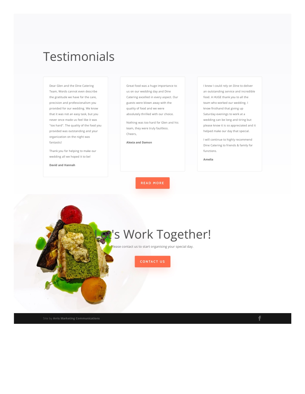Testimonials Dear Glen and the Dine Catering Great food was a huge importance to I knew I could rely on Dine to deliver Team, Words cannot even describe us on our wedding day and Dine an outstanding service and incredible the gratitude we have for the care, Catering excelled in every aspect. Our food. A HUGE thank you to all the precision and professionalism you guests were blown away with the team who worked our wedding. I provided for our wedding. We know quality of food and we were know firsthand that giving up that it was not an easy task, but you absolutely thrilled with our choice. Saturday evenings to work at a never once made us feel like it was wedding can be long and tiring but Nothing was too hard for Glen and his "too hard". The quality of the food you please know it is so appreciated and it team, they were truly faultless. provided was outstanding and your helped make our day that special. Cheers, organization on the night was I will continue to highly recommend fantastic! Alexia and Damon Dine Catering to friends & family for Thank you for helping to make our functions. wedding all we hoped it to be! Amelia David and Hannah READ MORE Let's Work Together! Please contact us to start organising your special day. C ONTAC T US Site by Arris Marketing Communications
