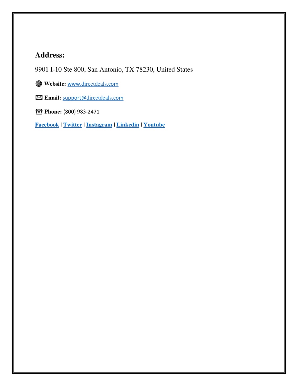 Address: 9901 I-10 Ste 800, San Antonio, TX 78230, United States ? ? Website:www.directdeals.com ✉️ ✉️ Email:support@directdeals.com ☎️ ☎️ Phone:(800) 983-2471 Facebook | Twitter | Instagram | Linkedin | Youtube