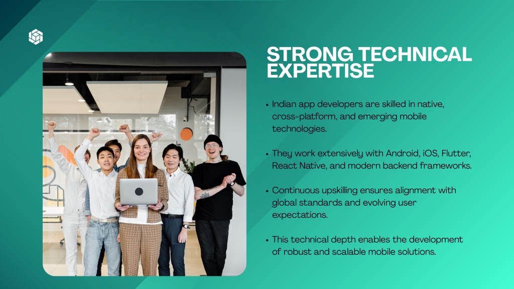 STRONG TECHNICAL EXPERTISE Indian app developers are skilled in native, cross-platform, and emerging mobile technologies. They work extensively with Android, iOS, Flutter, React Native, and modern backend frameworks. Continuous upskilling ensures alignment with global standards and evolving user expectations. This technical depth enables the development of robust and scalable mobile solutions.
