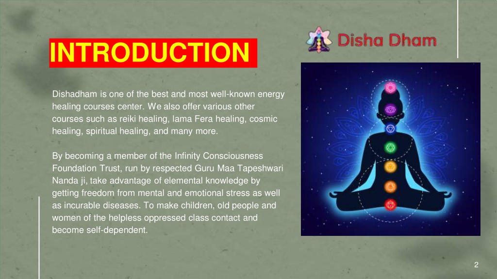 INTRODUCTION Dishadham is one of the best and most well-known energy healing courses center. We also offer various other courses such as reiki healing, lama Fera healing, cosmic healing, spiritual healing, and many more. By becoming a member of the Infinity Consciousness Foundation Trust, run by respected Guru Maa Tapeshwari Nanda ji, take advantage of elemental knowledge by getting freedom from mental and emotional stress as well as incurable diseases. To make children, old people and women of the helpless oppressed class contact and become self-dependent. 2