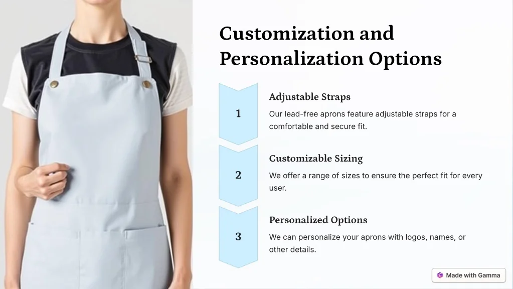 Customization and Personalization Options Adjustable Straps 1 Our lead-free aprons feature adjustable straps for a comfortable and secure fit. Customizable Sizing 2 We offer a range of sizes to ensure the perfect fit for every user. Personalized Options 3 We can personalize your aprons with logos, names, or other details.