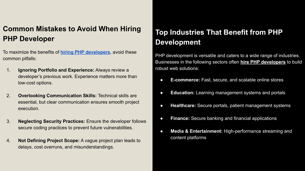 Common Mistakes to Avoid When Hiring PHP Developer Top Industries That Benefit from PHP Development To maximize the benefits of hiring PHP developers, avoid these common pitfalls: PHP development is versatile and caters to a wide range of industries. Businesses in the following sectors often hire PHP developers to build robust web solutions: 1. Ignoring Portfolio and Experience: Always review a developer’s previous work. Experience matters more than low-cost options. ● E-commerce: Fast, secure, and scalable online stores ● Education: Learning management systems and portals 2. Overlooking Communication Skills: Technical skills are essential, but clear communication ensures smooth project execution. ● Healthcare: Secure portals, patient management systems ● Finance: Secure banking and financial applications 3. Neglecting Security Practices: Ensure the developer follows secure coding practices to prevent future vulnerabilities. ● Media & Entertainment: High-performance streaming and content platforms 4. Not Defining Project Scope: A vague project plan leads to delays, cost overruns, and misunderstandings.