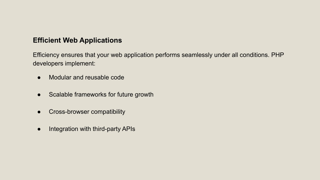 Efficient Web Applications Efficiency ensures that your web application performs seamlessly under all conditions. PHP developers implement: ● Modular and reusable code ● Scalable frameworks for future growth ● Cross-browser compatibility ● Integration with third-party APIs