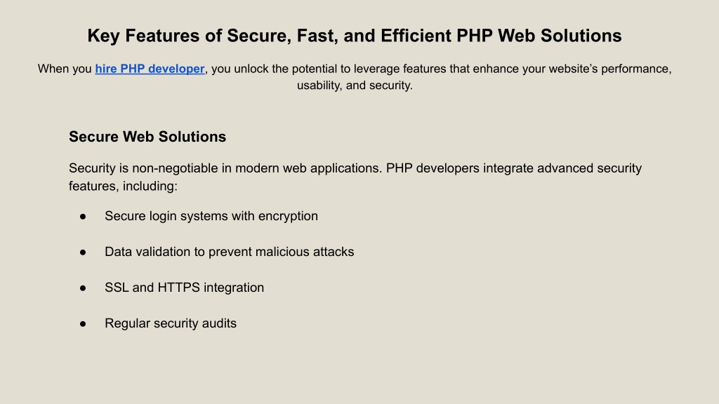 Key Features of Secure, Fast, and Efficient PHP Web Solutions When you hire PHP developer, you unlock the potential to leverage features that enhance your website’s performance, usability, and security. Secure Web Solutions Security is non-negotiable in modern web applications. PHP developers integrate advanced security features, including: ● Secure login systems with encryption ● Data validation to prevent malicious attacks ● SSL and HTTPS integration ● Regular security audits