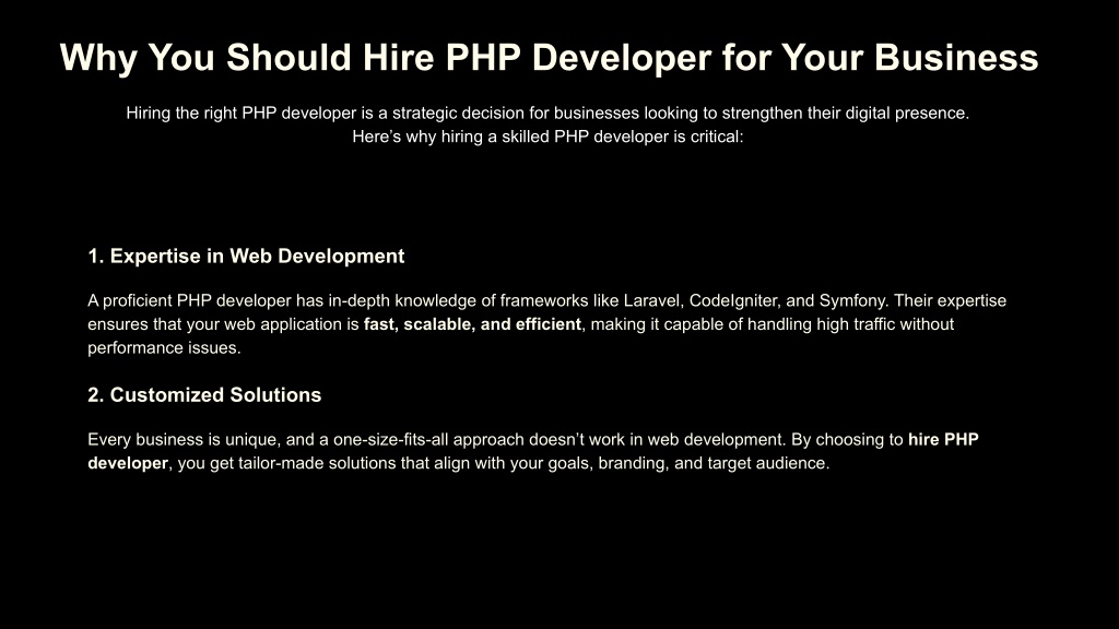 Why You Should Hire PHP Developer for Your Business Hiring the right PHP developer is a strategic decision for businesses looking to strengthen their digital presence. Here’s why hiring a skilled PHP developer is critical: 1. Expertise in Web Development A proficient PHP developer has in-depth knowledge of frameworks like Laravel, CodeIgniter, and Symfony. Their expertise ensures that your web application is fast, scalable, and efficient, making it capable of handling high traffic without performance issues. 2. Customized Solutions Every business is unique, and a one-size-fits-all approach doesn’t work in web development. By choosing to hire PHP developer, you get tailor-made solutions that align with your goals, branding, and target audience.