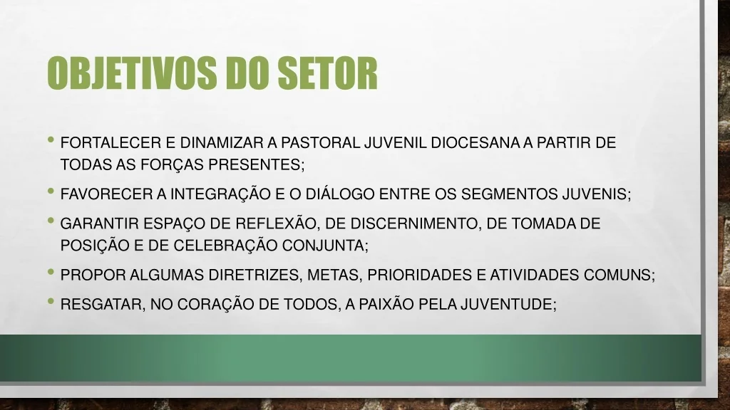 OBJETIVOS DO SETOR • fortalecer e dinamizar a Pastoral Juvenil diocesana a partir de todas as forças presentes; • favorecer a integração e o diálogo entre os segmentos juvenis; • garantir espaço de reflexão, de discernimento, de tomada de posição e de celebração conjunta; • propor algumas diretrizes, metas, prioridades e atividades comuns; • resgatar, no coração de todos, a paixão pela juventude;