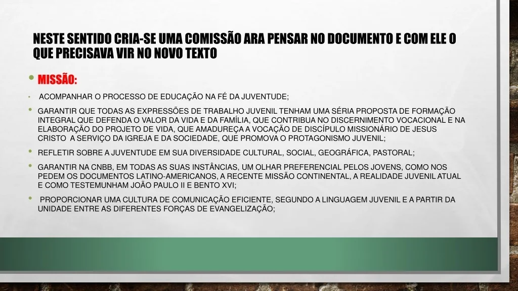 Neste sentido cria-se uma comissão ara pensar no documento e com ele o que precisava vir no novo texto • MISSÃO: • acompanhar o processo de educação na fé da juventude; • garantir que todas as expressões de trabalho juvenil tenham uma séria proposta de formação integral que defenda o valor da vida e da família, que contribua no discernimento vocacional e na elaboração do projeto de vida, que amadureça a vocação de discípulo missionário de Jesus Cristo a serviço da Igreja e da sociedade, que promova o protagonismo juvenil; • refletir sobre a juventude em sua diversidade cultural, social, geográfica, pastoral; • garantir na CNBB, em todas as suas instâncias, um olhar preferencial pelos jovens, como nos pedem os documentos latino-americanos, a recente Missão Continental, a realidade juvenil atual e como testemunham João Paulo II e Bento XVI; • proporcionar uma cultura de comunicação eficiente, segundo a linguagem juvenil e a partir da unidade entre as diferentes forças de evangelização;