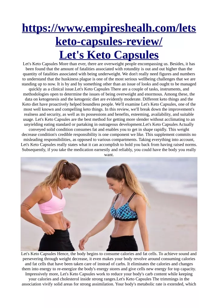 https://www.empireshealh.com/lets keto-capsules-review/ Let's Keto Capsules Let's Keto Capsules More than ever, there are overweight people encompassing us. Besides, it has been found that the amount of fatalities associated with rotundity is out and out higher than the quantity of fatalities associated with being underweight. We don't really need figures and numbers to understand that the huskiness plague is one of the most serious wellbeing challenges that we are standing up to now. It is by and by something other than an issue of looks and ought to be managed quickly as a clinical issue.Let's Keto Capsules There are a couple of tasks, instruments, and methodologies open to determine the issues of being overweight and enormous. Among these, the data on ketogenesis and the ketogenic diet are evidently moderate. Different keto things and the Keto diet have proactively helped boundless people. We'll examine Let's Keto Capsules, one of the most well known and compelling keto things. In this review, we'll break down the improvement's realness and security, as well as its possessions and benefits, esteeming, availability, and suitable usage. Let's Keto Capsules are the best method for getting more slender without acclimating to an unyielding eating standard or partaking in outrageous development.Let's Keto Capsules Actually conveyed solid condition consumes fat and enables you to get in shape rapidly. This weight decrease condition's credible responsibility is one component we like. This supplement commits no misleading responsibilities, as opposed to various compartments. Taking everything into account, Let's Keto Capsules really states what it can accomplish to hold you back from having raised norms. Subsequently, if you take the medication earnestly and reliably, you could have the body you really want. Let's Keto Capsules Hence, the body begins to consume calories and fat cells. To achieve sound and persevering through weight decrease, it even makes your body revolve around consuming calories and fat cells that have been taken care of instead of carbs. It eliminates the calories and changes them into energy to re-energize the body's energy stores and give cells new energy for top capacity. Impressively more, Let's Keto Capsules work to reduce your body's carb content while keeping your calories and cholesterol inside strong ranges.Let's Keto Capsules The trimmings in the association vivify solid areas for strong assimilation. Your body's metabolic rate is extended, which