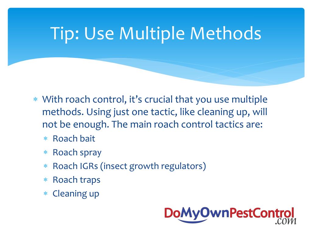 Tip: Use Multiple Methods • With roach control, it’s crucial that you use multiple methods. Using just one tactic, like cleaning up, will not be enough. The main roach control tactics are: • Roach bait • Roach spray • Roach IGRs (insect growth regulators) • Roach traps • Cleaning up