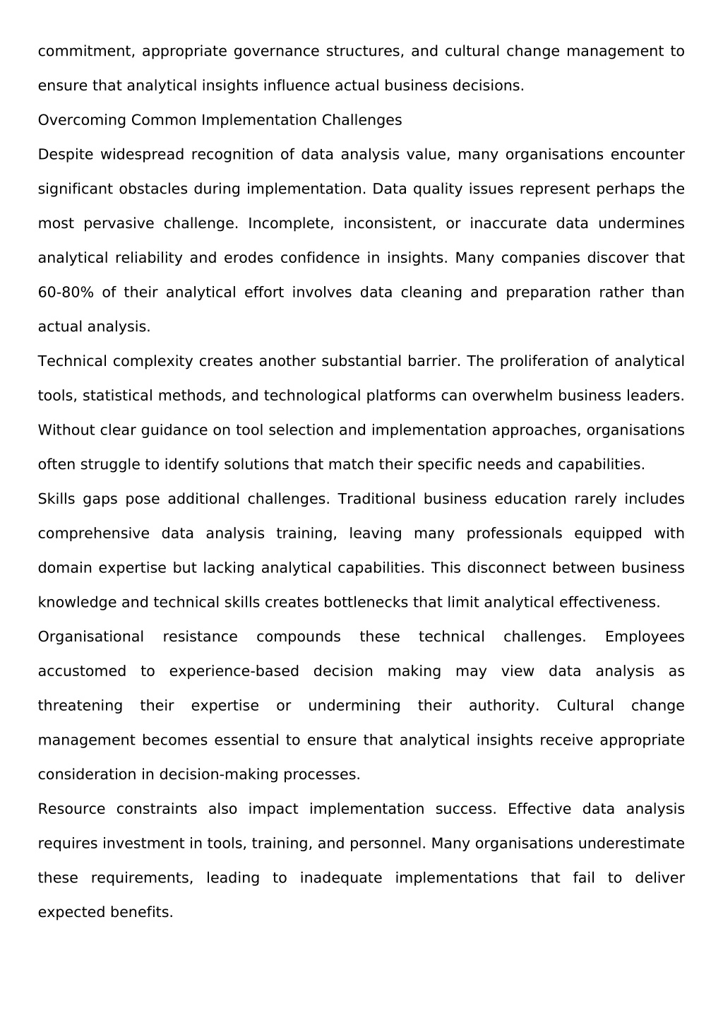 commitment, appropriate governance structures, and cultural change management to ensure that analytical insights influence actual business decisions. Overcoming Common Implementation Challenges Despite widespread recognition of data analysis value, many organisations encounter significant obstacles during implementation. Data quality issues represent perhaps the most pervasive challenge. Incomplete, inconsistent, or inaccurate data undermines analytical reliability and erodes confidence in insights. Many companies discover that 60-80% of their analytical effort involves data cleaning and preparation rather than actual analysis. Technical complexity creates another substantial barrier. The proliferation of analytical tools, statistical methods, and technological platforms can overwhelm business leaders. Without clear guidance on tool selection and implementation approaches, organisations often struggle to identify solutions that match their specific needs and capabilities. Skills gaps pose additional challenges. Traditional business education rarely includes comprehensive data analysis training, leaving many professionals equipped with domain expertise but lacking analytical capabilities. This disconnect between business knowledge and technical skills creates bottlenecks that limit analytical effectiveness. Organisational resistance compounds these technical challenges. Employees accustomed to experience-based decision making may view data analysis as threatening their expertise or undermining their authority. Cultural change management becomes essential to ensure that analytical insights receive appropriate consideration in decision-making processes. Resource constraints also impact implementation success. Effective data analysis requires investment in tools, training, and personnel. Many organisations underestimate these requirements, leading to inadequate implementations that fail to deliver expected benefits.