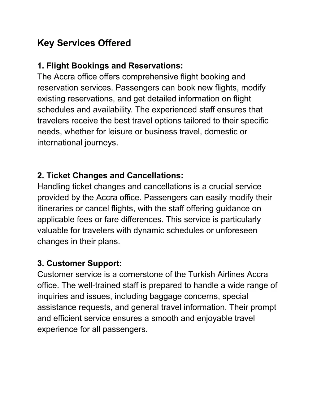 Key Services Offered 1. Flight Bookings and Reservations: The Accra office offers comprehensive flight booking and reservation services. Passengers can book new flights, modify existing reservations, and get detailed information on flight schedules and availability. The experienced staff ensures that travelers receive the best travel options tailored to their specific needs, whether for leisure or business travel, domestic or international journeys. 2. Ticket Changes and Cancellations: Handling ticket changes and cancellations is a crucial service provided by the Accra office. Passengers can easily modify their itineraries or cancel flights, with the staff offering guidance on applicable fees or fare differences. This service is particularly valuable for travelers with dynamic schedules or unforeseen changes in their plans. 3. Customer Support: Customer service is a cornerstone of the Turkish Airlines Accra office. The well-trained staff is prepared to handle a wide range of inquiries and issues, including baggage concerns, special assistance requests, and general travel information. Their prompt and efficient service ensures a smooth and enjoyable travel experience for all passengers.