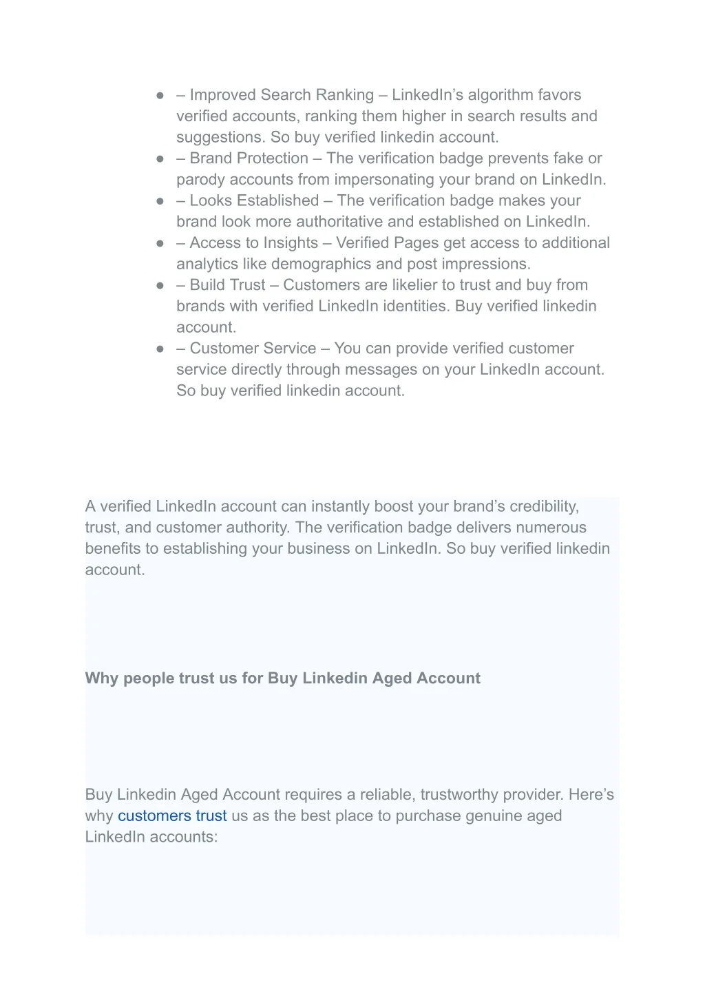 ● – Improved Search Ranking – LinkedIn’s algorithm favors verified accounts, ranking them higher in search results and suggestions. So buy verified linkedin account. ● – Brand Protection – The verification badge prevents fake or parody accounts from impersonating your brand on LinkedIn. ● – Looks Established – The verification badge makes your brand look more authoritative and established on LinkedIn. ● – Access to Insights – Verified Pages get access to additional analytics like demographics and post impressions. ● – Build Trust – Customers are likelier to trust and buy from brands with verified LinkedIn identities. Buy verified linkedin account. ● – Customer Service – You can provide verified customer service directly through messages on your LinkedIn account. So buy verified linkedin account. A verified LinkedIn account can instantly boost your brand’s credibility, trust, and customer authority. The verification badge delivers numerous benefits to establishing your business on LinkedIn. So buy verified linkedin account. Why people trust us for Buy Linkedin Aged Account Buy Linkedin Aged Account requires a reliable, trustworthy provider. Here’s why customers trust us as the best place to purchase genuine aged LinkedIn accounts: