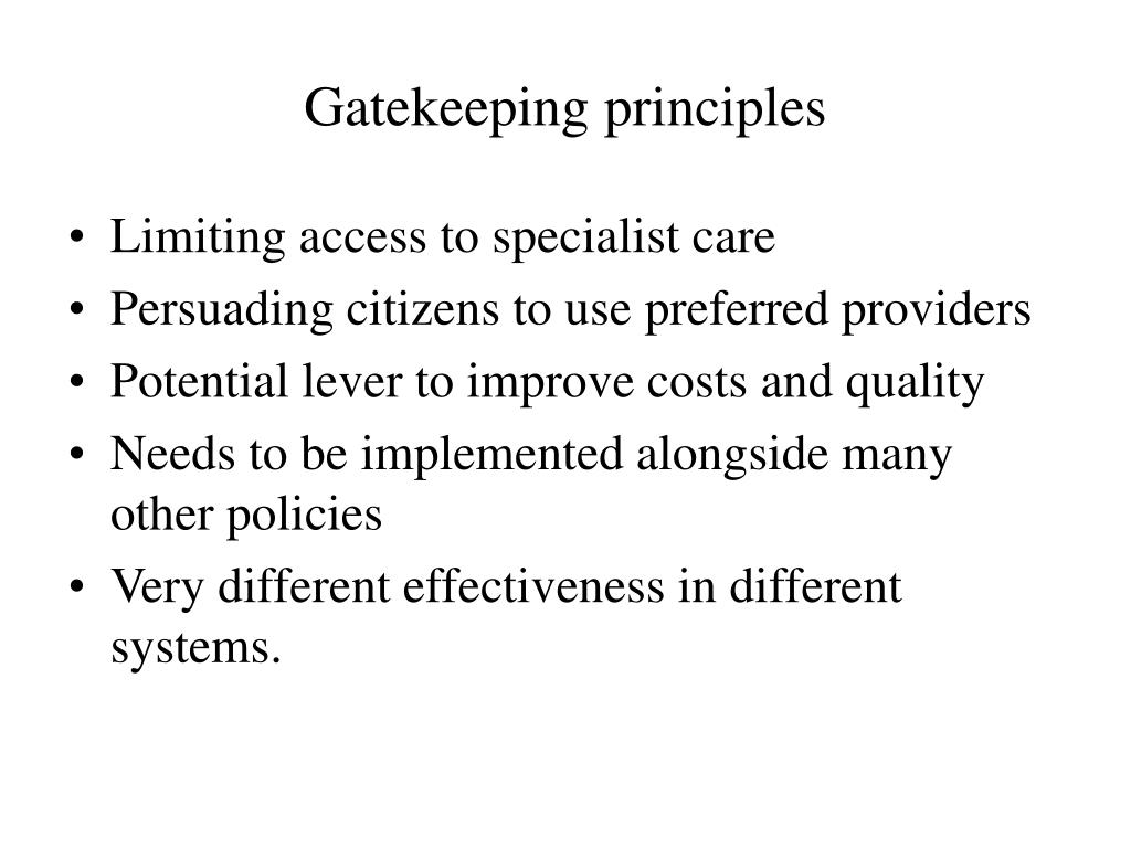 Gatekeeping principles • Limiting access to specialist care • Persuading citizens to use preferred providers • Potential lever to improve costs and quality • Needs to be implemented alongside many other policies • Very different effectiveness in different systems.