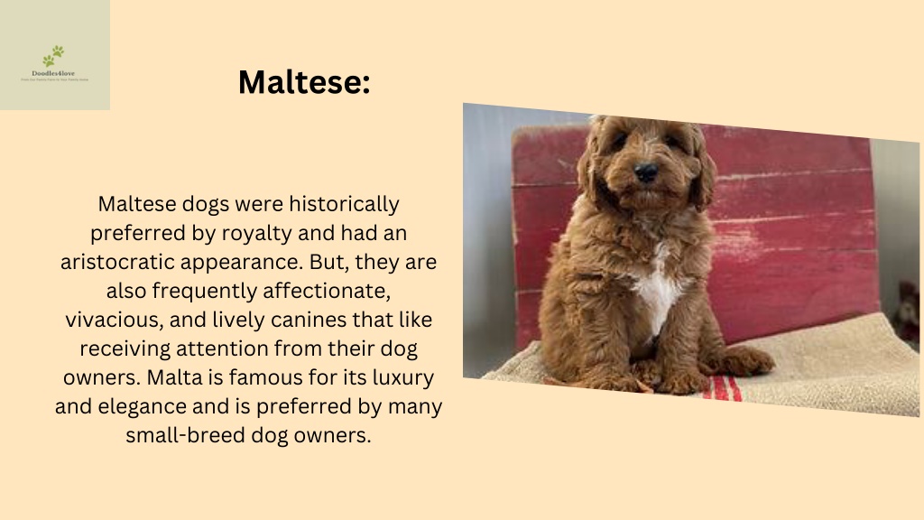 Maltese: Maltese dogs were historically preferred by royalty and had an aristocratic appearance. But, they are also frequently affectionate, vivacious, and lively canines that like receiving attention from their dog owners. Malta is famous for its luxury and elegance and is preferred by many small-breed dog owners.