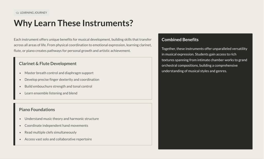 LEARNING JOURNEY Why Learn These Instruments? Combined Benefits Each instrument offers unique benefits for musical development, building skills that transfer across all areas of life. From physical coordination to emotional expression, learning clarinet, flute, or piano creates pathways for personal growth and artistic achievement. Together, these instruments offer unparalleled versatility in musical expression. Students gain access to rich textures spanning from intimate chamber works to grand orchestral compositions, building a comprehensive understanding of musical styles and genres. Clarinet & Flute Development Master breath control and diaphragm support Develop precise finger dexterity and coordination Build embouchure strength and tonal control Learn ensemble listening and blend Piano Foundations Understand music theory and harmonic structure Coordinate independent hand movements Read multiple clefs simultaneously Access vast solo and collaborative repertoire