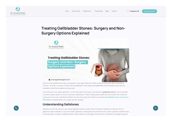 Home AboutDoctor Treatments Testimonials Blogs Contact Emergency Call Book Appointment Treating Gallbladder Stones: Surgery and Non- Surgery Options Explained Haveyoueverexperiencedasharp, achingpaininyourupperabdomen? Whileoccasionaldiscomfortafterabigmealis common, forsome, itcansignanissuewiththegallbladder. Somepeoplewithgallbladderstonetreatmentneverhaveany symptoms, whileothersexperienceseverepain. Ifyoufeelpaininyourupperabdomenorontherightsideofyourbody, itmaybeduetogallbladderstones, anditʼsessential toconsultagastrodoctorforadvicetopreventcomplications. Theseirritatingstonesmightblockthesmoothflowofbileand causepainorevenmoresignificantproblems. So, howdoyougetridofthem? Letʼsexplorethegallbladderstonetreatment in Ahmedabad, includingoptionsforsurgeryandnon-surgery! Understanding Gallstones Gallstonesareliketinystonesinyourbodyʼsdigestivesystem, usuallymadeofhardenedcholesterolorbilirubin. Notall gallstonesrequiretreatment. Ifyouhave “silent” gallstones, meaningtheyarepresentbutdonʼtcausesymptoms, treatmentmay notbenecessary. However, ifgallstonesleadtopain, infection, orblockagesinthebileduct, interventionisneededtoprevent