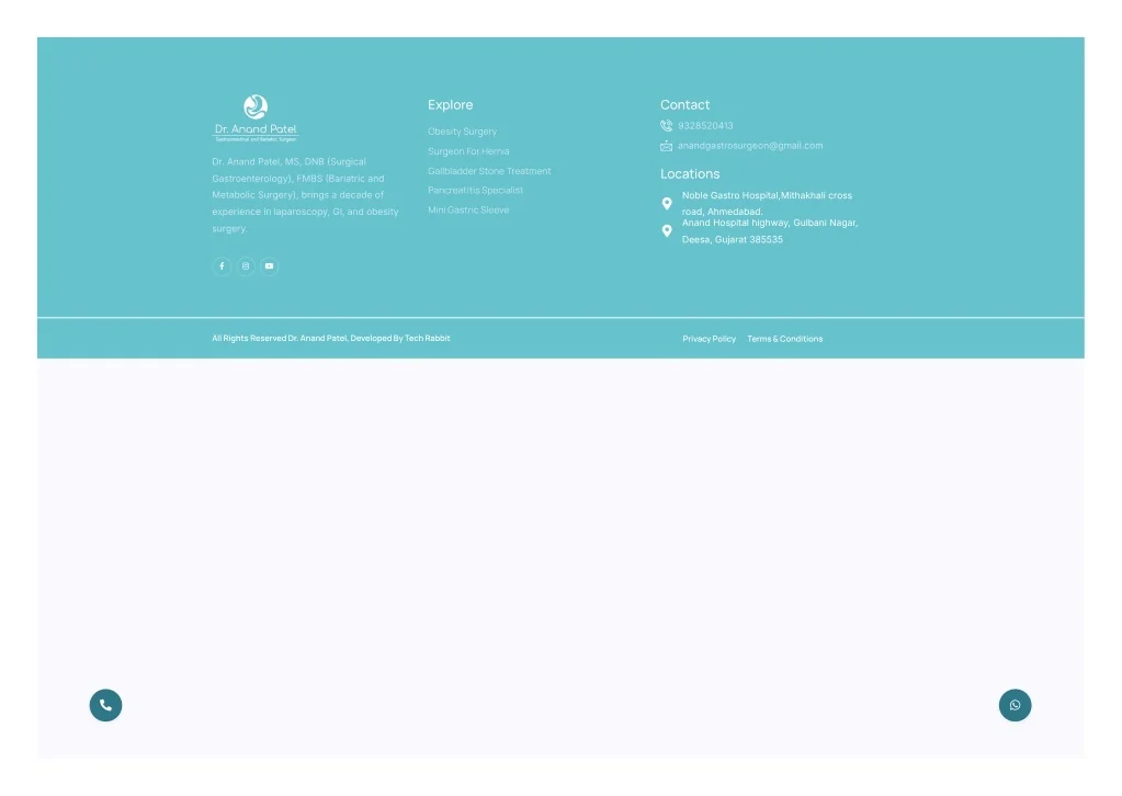 Explore Contact 9328520413 Obesity Surgery anandgastrosurgeon@gmail.com Surgeon For Hernia Dr. AnandPatel, MS, DNB ?Surgical Gallbladder Stone Treatment Locations Gastroenterology), FMBS ?Bariatricand Pancreatitis Specialist MetabolicSurgery), bringsadecadeof NobleGastroHospital,Mithakhalicross Mini Gastric Sleeve experienceinlaparoscopy, GI, andobesity road, Ahmedabad. AnandHospitalhighway, GulbaniNagar, surgery. Deesa, Gujarat 385535 All Rights Reserved Dr. Anand Patel, Developed By Tech Rabbit Privacy Policy Terms & Conditions