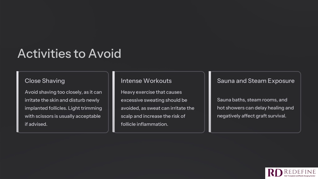 Activities to Avoid Close Shaving Intense Workouts Sauna and Steam Exposure Avoid shaving too closely, as it can irritate the skin and disturb newly implanted follicles. Light trimming with scissors is usually acceptable if advised. Heavy exercise that causes excessive sweating should be avoided, as sweat can irritate the scalp and increase the risk of follicle inflammation. Sauna baths, steam rooms, and hot showers can delay healing and negatively affect graft survival.