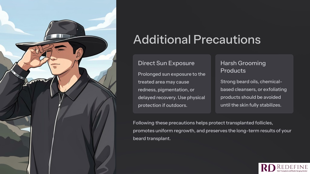Additional Precautions Direct Sun Exposure Harsh Grooming Products Prolonged sun exposure to the treated area may cause redness, pigmentation, or delayed recovery. Use physical protection if outdoors. Strong beard oils, chemical-based cleansers, or exfoliating products should be avoided until the skin fully stabilizes. Following these precautions helps protect transplanted follicles, promotes uniform regrowth, and preserves the long-term results of your beard transplant.