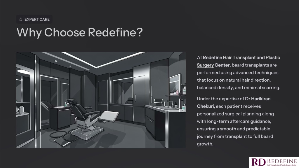 EXPERT CARE Why Choose Redefine? At Redefine Hair Transplant and Plastic Surgery Center, beard transplants are performed using advanced techniques that focus on natural hair direction, balanced density, and minimal scarring. Under the expertise of Dr Harikiran Chekuri, each patient receives personalized surgical planning along with long-term aftercare guidance, ensuring a smooth and predictable journey from transplant to full beard growth.