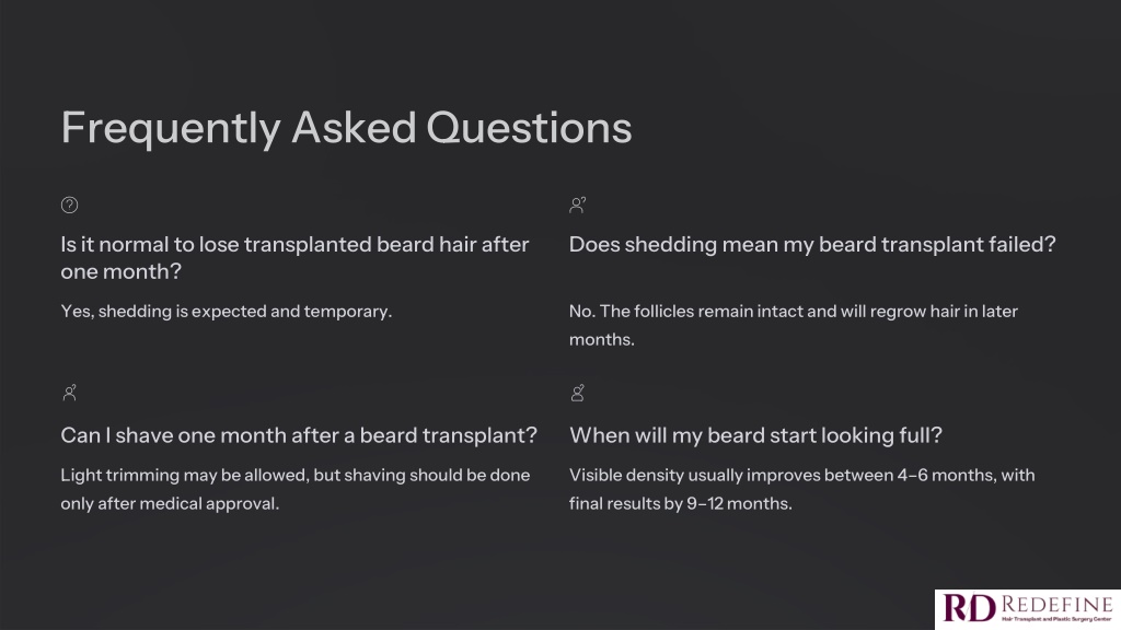 Frequently Asked Questions Is it normal to lose transplanted beard hair after one month? Does shedding mean my beard transplant failed? Yes, shedding is expected and temporary. No. The follicles remain intact and will regrow hair in later months. Can I shave one month after a beard transplant? When will my beard start looking full? Light trimming may be allowed, but shaving should be done only after medical approval. Visible density usually improves between 4–6 months, with final results by 9–12 months.