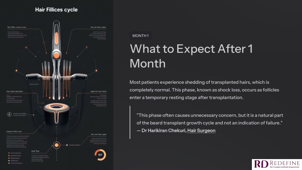 MONTH 1 What to Expect After 1 Month Most patients experience shedding of transplanted hairs, which is completely normal. This phase, known as shock loss, occurs as follicles enter a temporary resting stage after transplantation. "This phase often causes unnecessary concern, but it is a natural part of the beard transplant growth cycle and not an indication of failure." — Dr Harikiran Chekuri, Hair Surgeon