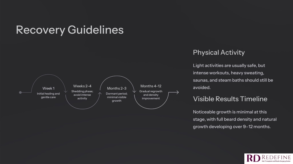 Recovery Guidelines Physical Activity Light activities are usually safe, but intense workouts, heavy sweating, saunas, and steam baths should still be avoided. Weeks 2-4 Months 4-12 Week 1 Months 2-3 Shedding phase; avoid intense activity Gradual regrowth and density improvement Initial healing and gentle care Dormant period; minimal visible growth Visible Results Timeline Noticeable growth is minimal at this stage, with full beard density and natural growth developing over 9–12 months.