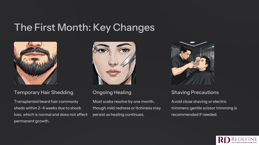 The First Month: Key Changes Temporary Hair Shedding Ongoing Healing Shaving Precautions Transplanted beard hair commonly sheds within 2–4 weeks due to shock loss, which is normal and does not affect permanent growth. Most scabs resolve by one month, though mild redness or itchiness may persist as healing continues. Avoid close shaving or electric trimmers; gentle scissor trimming is recommended if needed.