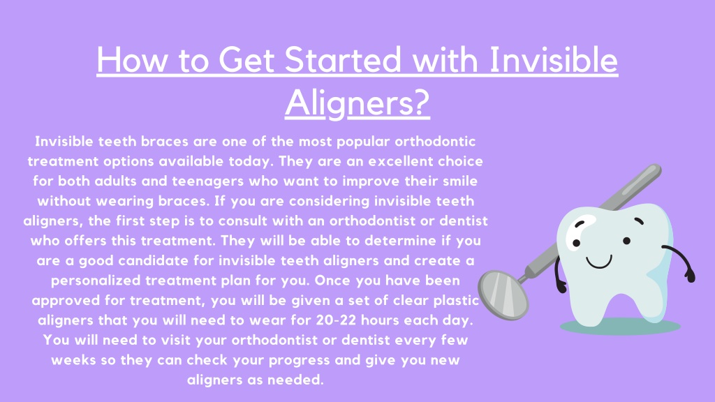 How to Get Started with Invisible Aligners? Invisible teeth braces are one of the most popular orthodontic treatment options available today. They are an excellent choice for both adults and teenagers who want to improve their smile without wearing braces. If you are considering invisible teeth aligners, the first step is to consult with an orthodontist or dentist who offers this treatment. They will be able to determine if you are a good candidate for invisible teeth aligners and create a personalized treatment plan for you. Once you have been approved for treatment, you will be given a set of clear plastic aligners that you will need to wear for 20-22 hours each day. You will need to visit your orthodontist or dentist every few weeks so they can check your progress and give you new aligners as needed.