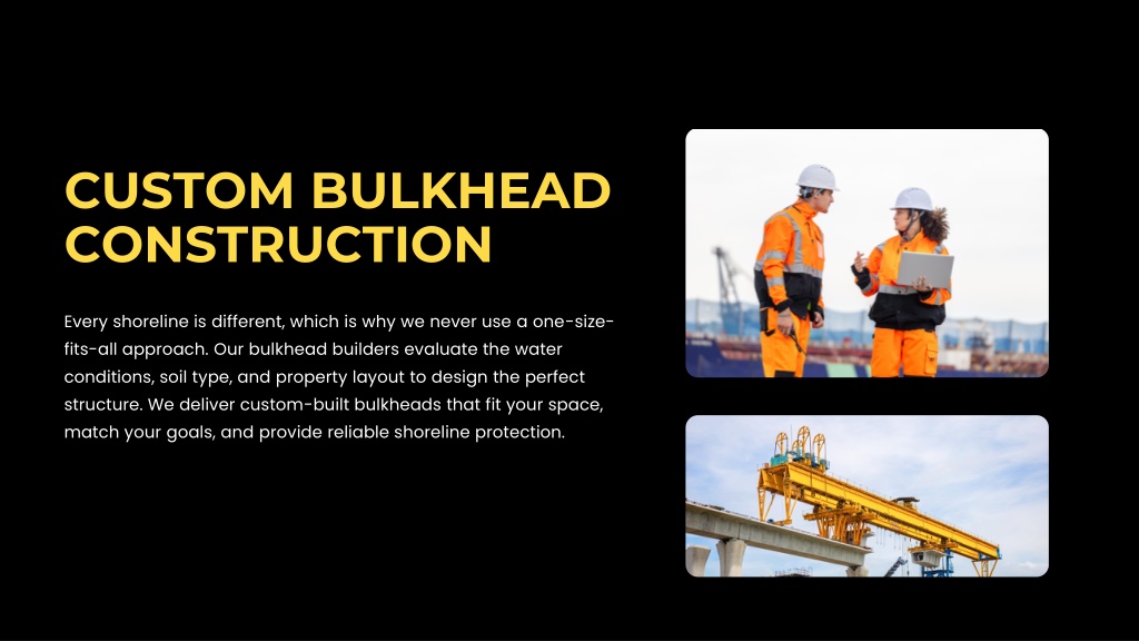 CUSTOM BULKHEAD CONSTRUCTION Every shoreline is different, which is why we never use a one-size-fits-all approach. Our bulkhead builders evaluate the water conditions, soil type, and property layout to design the perfect structure. We deliver custom-built bulkheads that fit your space, match your goals, and provide reliable shoreline protection.