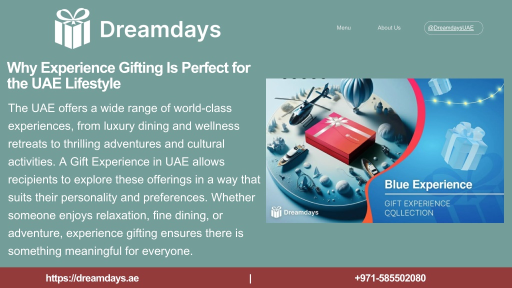 Menu About Us @DreamdaysUAE Flexibility and Freedom of Choice One of the biggest challenges in gifting is choosing something that truly matches the recipient’s taste. Experience gifting solves this problem by offering flexibility. A Gift Experience in UAE allows recipients to choose what they want to do and when they want to do it, making the gift stress-free and enjoyable for both the giver and the receiver. https://dreamdays.ae | +971-585502080