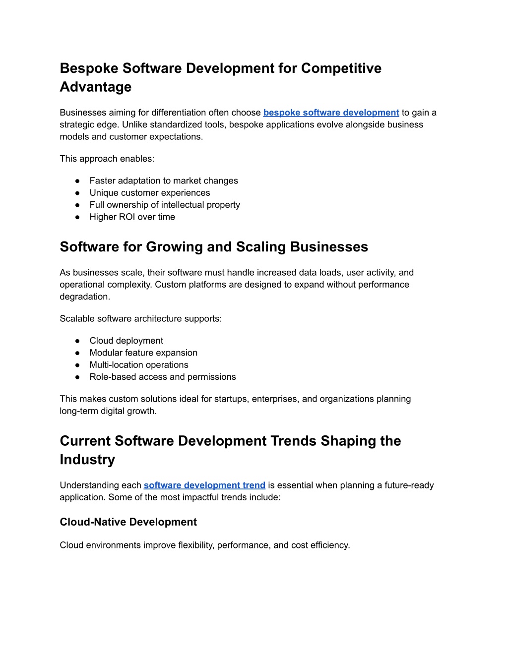 3. Bespoke Software Development for Competitive Advantage Businesses aiming for differentiation often choose bespoke software development to gain a strategic edge. Unlike standardized tools, bespoke applications evolve alongside business models and customer expectations. This approach enables: ● Faster adaptation to market changes ● Unique customer experiences ● Full ownership of intellectual property ● Higher ROI over time Software for Growing and Scaling Businesses As businesses scale, their software must handle increased data loads, user activity, and operational complexity. Custom platforms are designed to expand without performance degradation. Scalable software architecture supports: ● Cloud deployment ● Modular feature expansion ● Multi-location operations ● Role-based access and permissions This makes custom solutions ideal for startups, enterprises, and organizations planning long-term digital growth. Current Software Development Trends Shaping the Industry Understanding each software development trend is essential when planning a future-ready application. Some of the most impactful trends include: Cloud-Native Development Cloud environments improve flexibility, performance, and cost efficiency.