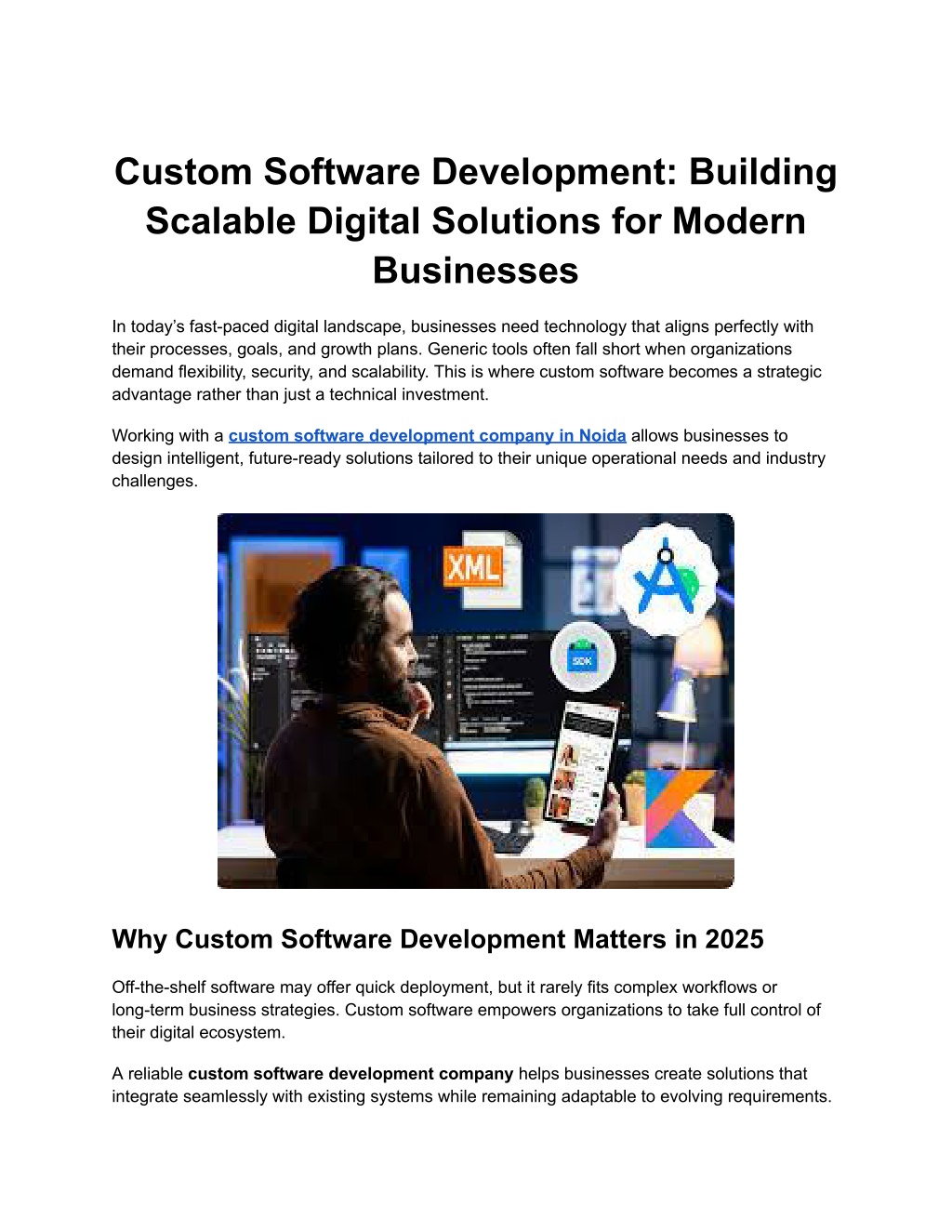 1. Custom Software Development: Building Scalable Digital Solutions for Modern Businesses In today’s fast-paced digital landscape, businesses need technology that aligns perfectly with their processes, goals, and growth plans. Generic tools often fall short when organizations demand flexibility, security, and scalability. This is where custom software becomes a strategic advantage rather than just a technical investment. Working with a custom software development company in Noida allows businesses to design intelligent, future-ready solutions tailored to their unique operational needs and industry challenges. Why Custom Software Development Matters in 2025 Off-the-shelf software may offer quick deployment, but it rarely fits complex workflows or long-term business strategies. Custom software empowers organizations to take full control of their digital ecosystem. A reliable custom software development company helps businesses create solutions that integrate seamlessly with existing systems while remaining adaptable to evolving requirements.