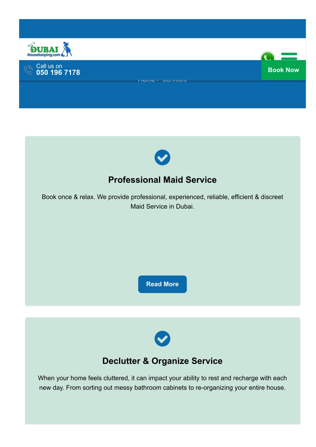 Services Call us on 050 196 7178 Book Now Home > Services Professional Maid Service Book once & relax. We provide professional, experienced, reliable, efficient & discreet Maid Service in Dubai. Read More Declutter & Organize Service When your home feels cluttered, it can impact your ability to rest and recharge with each new day. From sorting out messy bathroom cabinets to reorganizing your entire house.