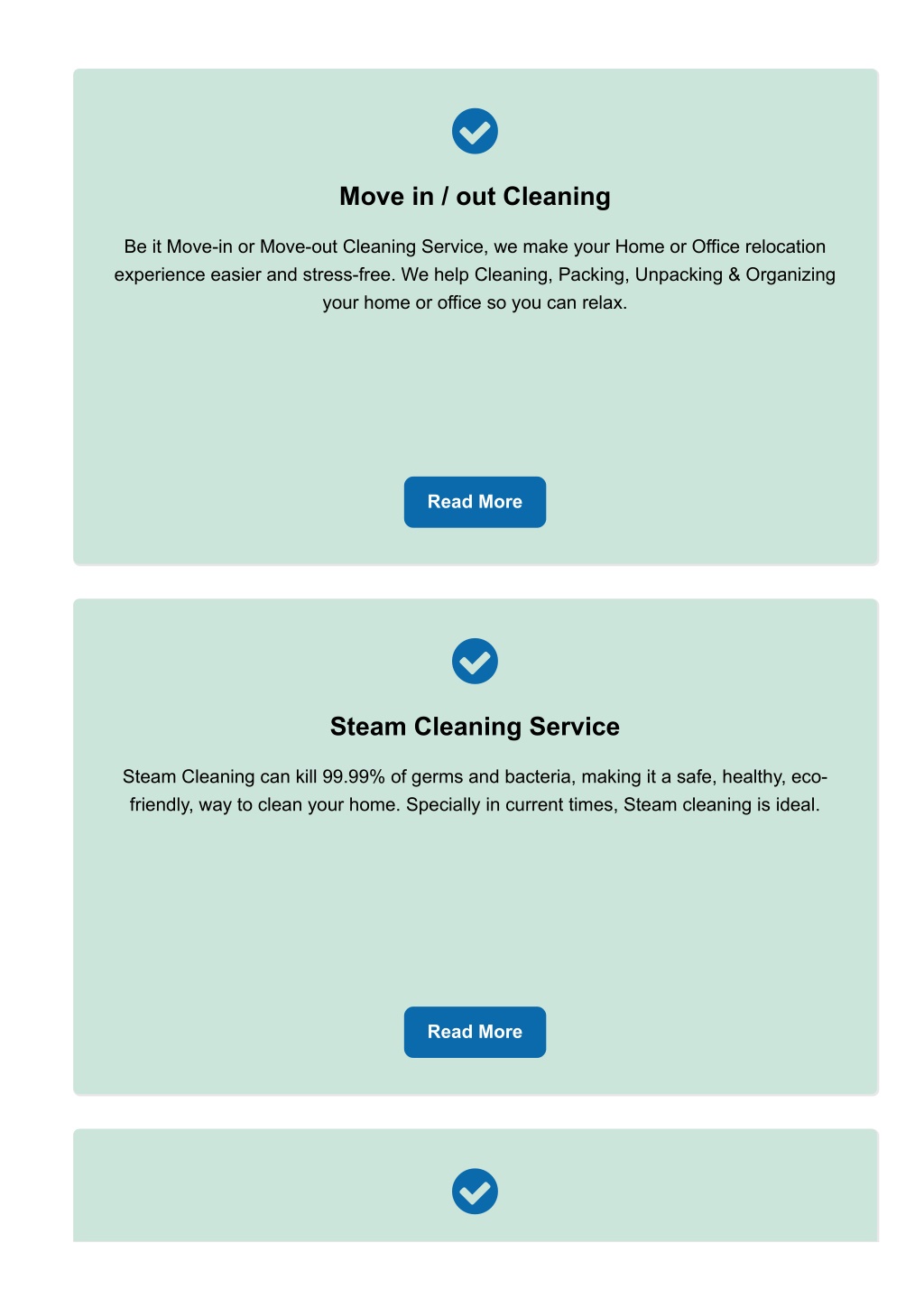 Move in / out Cleaning Be it Movein or Moveout Cleaning Service, we make your Home or Office relocation experience easier and stressfree. We help Cleaning, Packing, Unpacking & Organizing your home or office so you can relax. Read More Steam Cleaning Service Steam Cleaning can kill 99.99% of germs and bacteria, making it a safe, healthy, eco friendly, way to clean your home. Specially in current times, Steam cleaning is ideal. Read More