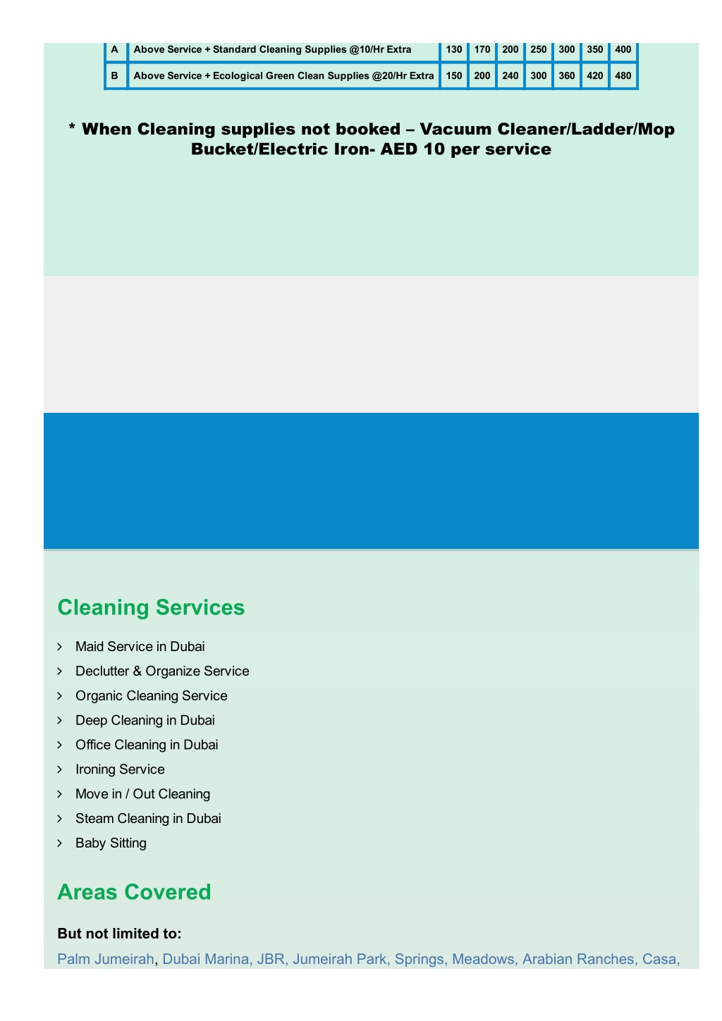 A Above Service + Standard Cleaning Supplies @10/Hr Extra 130 170 200 250 300 350 400 B Above Service + Ecological Green Clean Supplies @20/Hr Extra 150 200 240 300 360 420 480 * When Cleaning supplies not booked – Vacuum Cleaner/Ladder/Mop Bucket/Electric Iron AED 10 per service Cleaning Services Maid Service in Dubai Declutter & Organize Service Organic Cleaning Service Deep Cleaning in Dubai Office Cleaning in Dubai Ironing Service Move in / Out Cleaning Steam Cleaning in Dubai Baby Sitting Areas Covered But not limited to: Palm Jumeirah, Dubai Marina, JBR, Jumeirah Park, Springs, Meadows, Arabian Ranches, Casa,