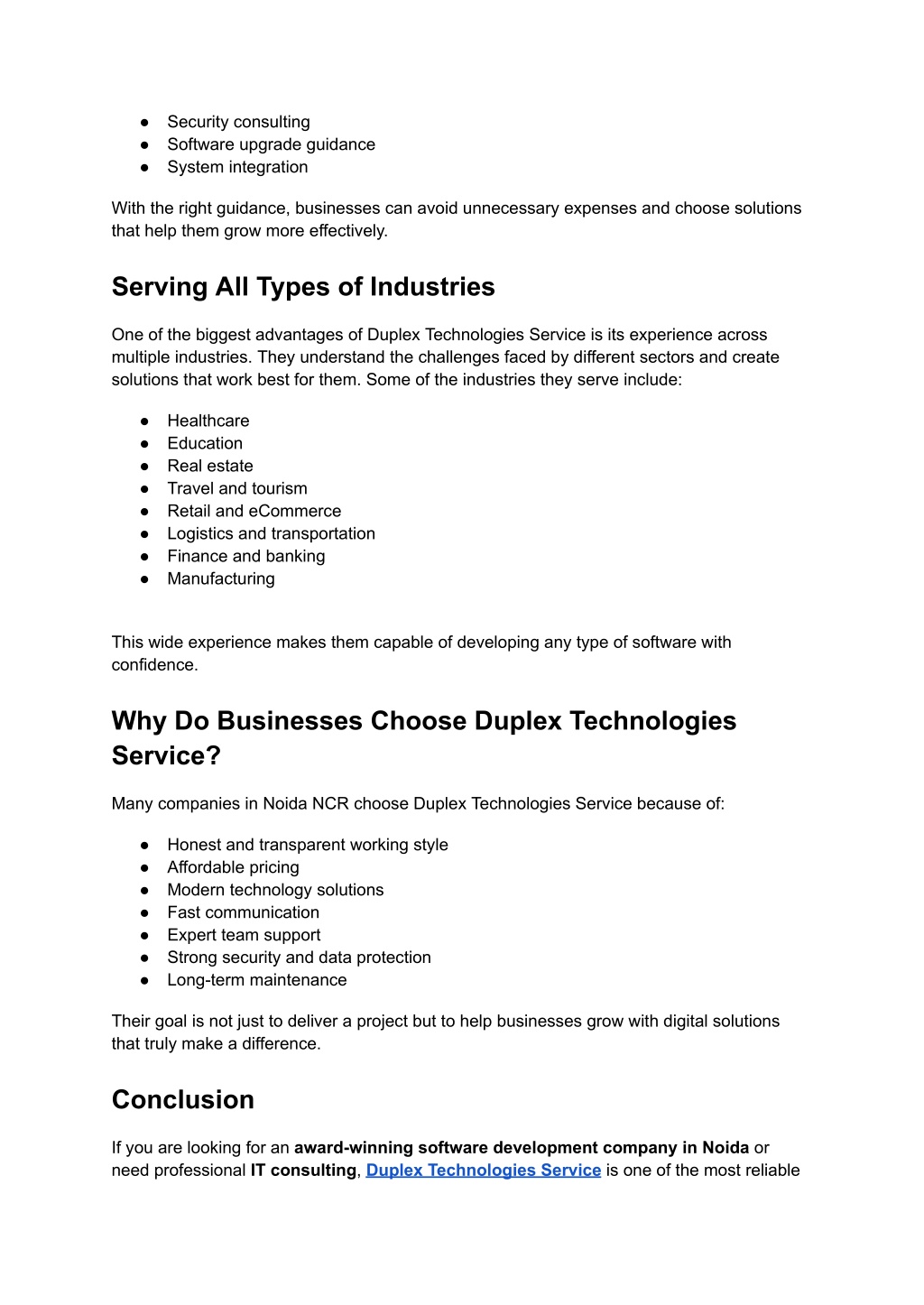 ● Security consulting ● Software upgrade guidance ● System integration With the right guidance, businesses can avoid unnecessary expenses and choose solutions that help them grow more effectively. Serving All Types of Industries One of the biggest advantages of Duplex Technologies Service is its experience across multiple industries. They understand the challenges faced by different sectors and create solutions that work best for them. Some of the industries they serve include: ● Healthcare ● Education ● Real estate ● Travel and tourism ● Retail and eCommerce ● Logistics and transportation ● Finance and banking ● Manufacturing This wide experience makes them capable of developing any type of software with confidence. Why Do Businesses Choose Duplex Technologies Service? Many companies in Noida NCR choose Duplex Technologies Service because of: ● Honest and transparent working style ● Affordable pricing ● Modern technology solutions ● Fast communication ● Expert team support ● Strong security and data protection ● Long-term maintenance Their goal is not just to deliver a project but to help businesses grow with digital solutions that truly make a difference. Conclusion If you are looking for an award-winning software development company in Noida or need professional IT consulting, Duplex Technologies Service is one of the most reliable
