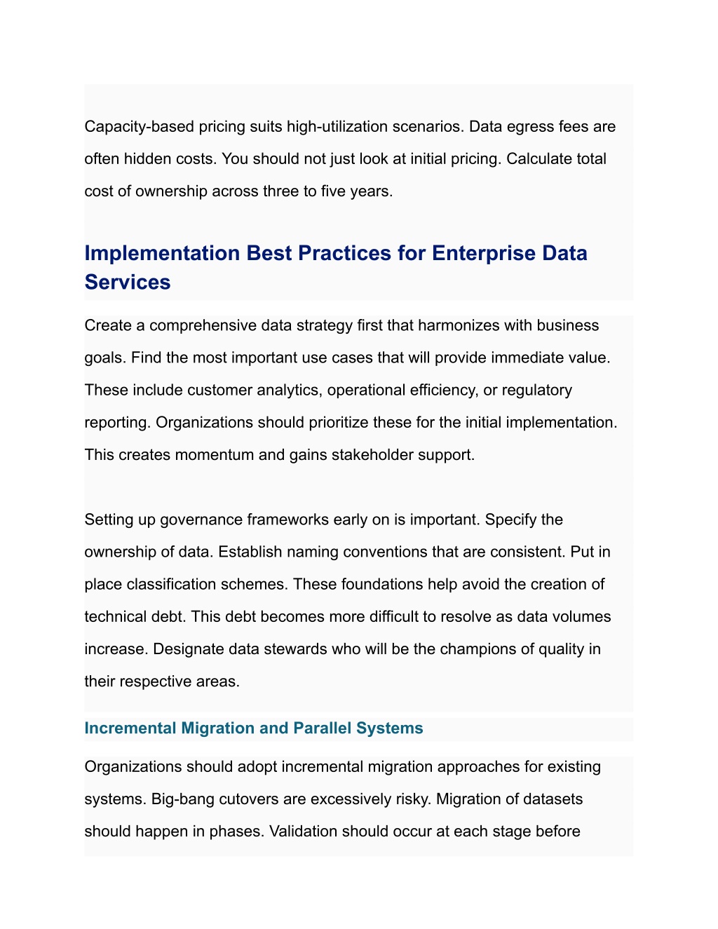 Capacity-based pricing suits high-utilization scenarios. Data egress fees are often hidden costs. You should not just look at initial pricing. Calculate total cost of ownership across three to five years. Implementation Best Practices for Enterprise Data Services Create a comprehensive data strategy first that harmonizes with business goals. Find the most important use cases that will provide immediate value. These include customer analytics, operational efficiency, or regulatory reporting. Organizations should prioritize these for the initial implementation. This creates momentum and gains stakeholder support. Setting up governance frameworks early on is important. Specify the ownership of data. Establish naming conventions that are consistent. Put in place classification schemes. These foundations help avoid the creation of technical debt. This debt becomes more difficult to resolve as data volumes increase. Designate data stewards who will be the champions of quality in their respective areas. Incremental Migration and Parallel Systems Organizations should adopt incremental migration approaches for existing systems. Big-bang cutovers are excessively risky. Migration of datasets should happen in phases. Validation should occur at each stage before