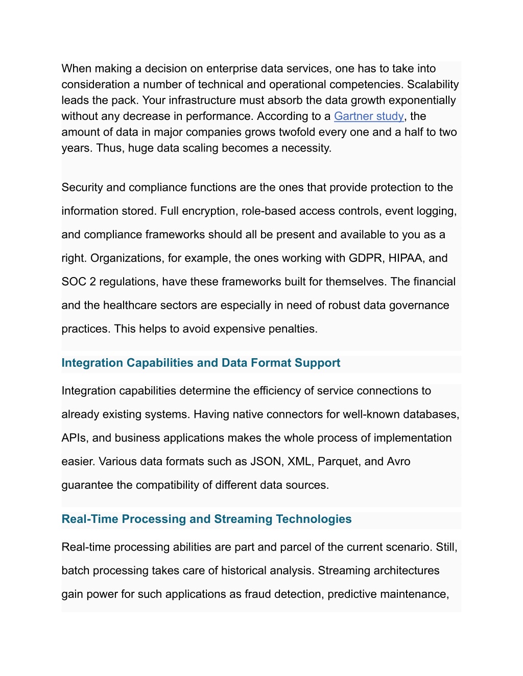 When making a decision on enterprise data services, one has to take into consideration a number of technical and operational competencies. Scalability leads the pack. Your infrastructure must absorb the data growth exponentially without any decrease in performance. According to a Gartner study, the amount of data in major companies grows twofold every one and a half to two years. Thus, huge data scaling becomes a necessity. Security and compliance functions are the ones that provide protection to the information stored. Full encryption, role-based access controls, event logging, and compliance frameworks should all be present and available to you as a right. Organizations, for example, the ones working with GDPR, HIPAA, and SOC 2 regulations, have these frameworks built for themselves. The financial and the healthcare sectors are especially in need of robust data governance practices. This helps to avoid expensive penalties. Integration Capabilities and Data Format Support Integration capabilities determine the efficiency of service connections to already existing systems. Having native connectors for well-known databases, APIs, and business applications makes the whole process of implementation easier. Various data formats such as JSON, XML, Parquet, and Avro guarantee the compatibility of different data sources. Real-Time Processing and Streaming Technologies Real-time processing abilities are part and parcel of the current scenario. Still, batch processing takes care of historical analysis. Streaming architectures gain power for such applications as fraud detection, predictive maintenance,