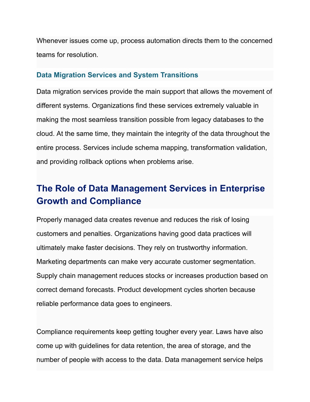 Whenever issues come up, process automation directs them to the concerned teams for resolution. Data Migration Services and System Transitions Data migration services provide the main support that allows the movement of different systems. Organizations find these services extremely valuable in making the most seamless transition possible from legacy databases to the cloud. At the same time, they maintain the integrity of the data throughout the entire process. Services include schema mapping, transformation validation, and providing rollback options when problems arise. The Role of Data Management Services in Enterprise Growth and Compliance Properly managed data creates revenue and reduces the risk of losing customers and penalties. Organizations having good data practices will ultimately make faster decisions. They rely on trustworthy information. Marketing departments can make very accurate customer segmentation. Supply chain management reduces stocks or increases production based on correct demand forecasts. Product development cycles shorten because reliable performance data goes to engineers. Compliance requirements keep getting tougher every year. Laws have also come up with guidelines for data retention, the area of storage, and the number of people with access to the data. Data management service helps