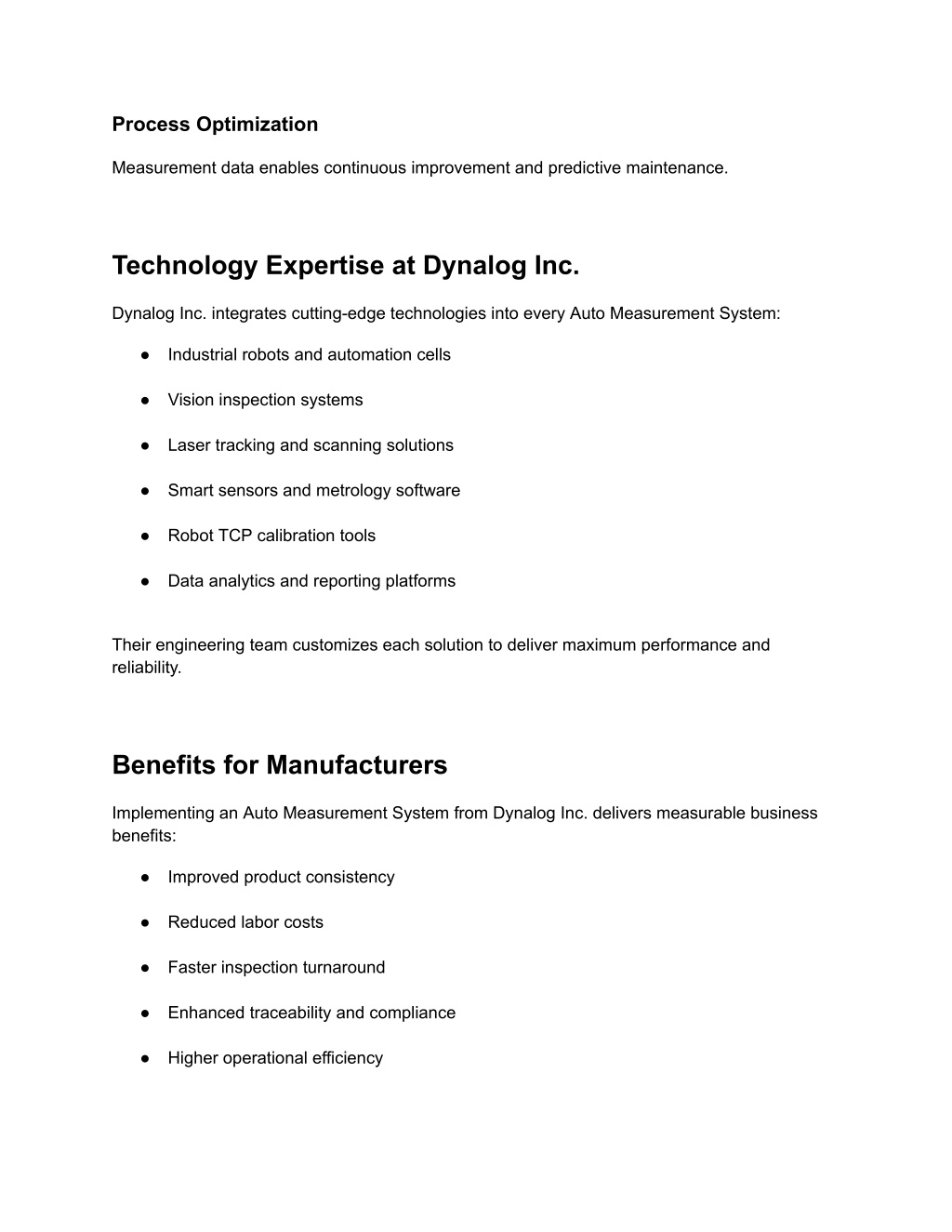 4. ● Reduced human error Automation empowers manufacturers to meet strict quality standards while remaining competitive in global markets. Why Dynalog Inc. Stands Out Dynalog Inc. is recognized for its commitment to innovation, technical excellence, and customer satisfaction. From consultation and system design to installation and ongoing support, Dynalog Inc. delivers end-to-end automation solutions that drive operational success. Their expertise in robotic inspection, calibration, and automated measurement ensures dependable results across diverse industrial applications. Conclusion If your organization is seeking a reliable and scalable Auto Measurement System, Dynalog Inc. offers advanced automation solutions designed to improve accuracy, efficiency, and quality. With industry-leading technology and expert engineering support, Dynalog Inc. helps businesses transform their measurement and inspection processes. Invest in automation today and future-proof your manufacturing operations with Dynalog Inc.
