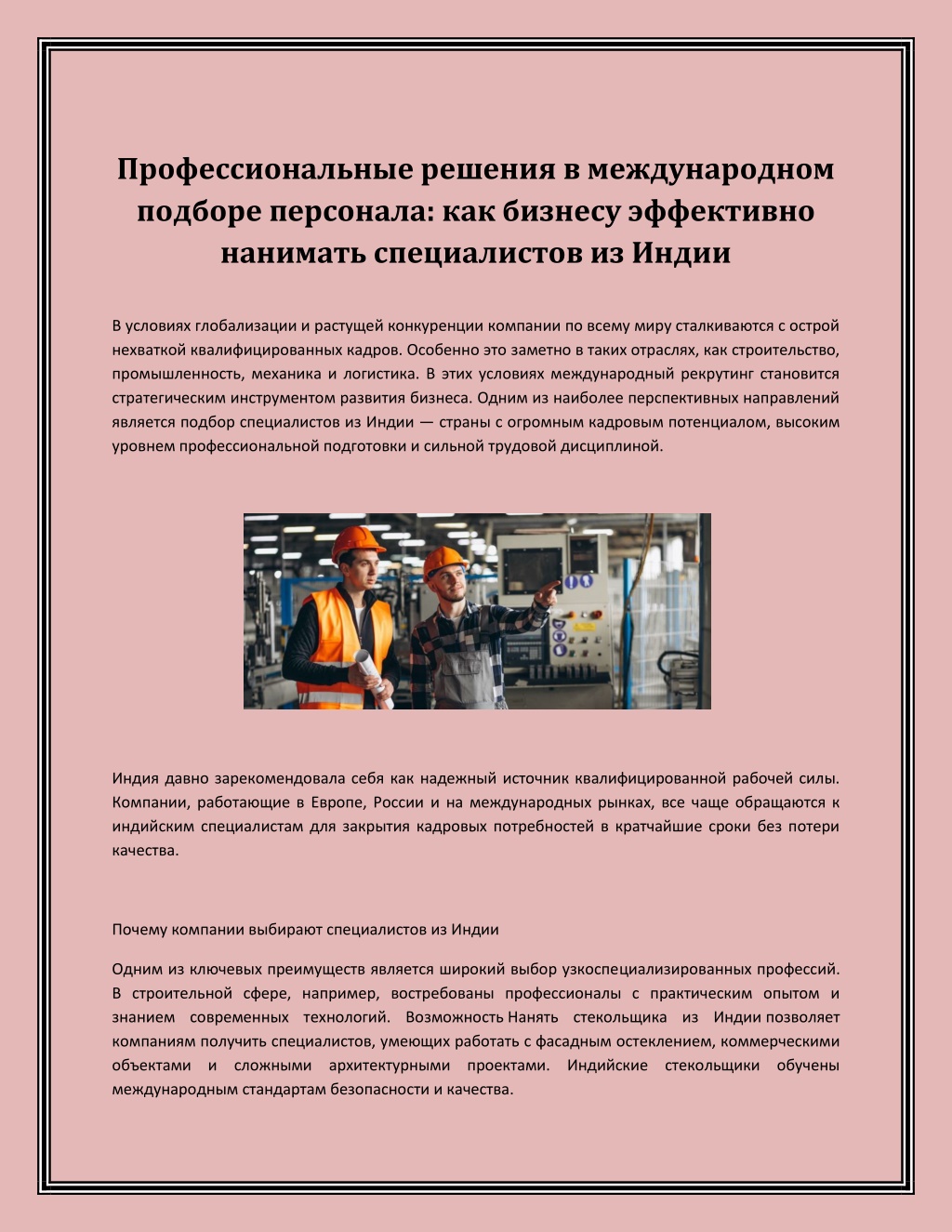 Профессиональные решения в международном подборе персонала: как бизнесу эффективно нанимать специалистов из Индии В условиях глобализации и растущей конкуренции компании по всему миру сталкиваются с острой нехваткой квалифицированных кадров. Особенно этозаметно в таких отраслях, как строительство, промышленность, механика и логистика. В этих условиях международный рекрутинг становится стратегическим инструментом развития бизнеса. Одним из наиболее перспективных направлений является подбор специалистов изИндии —страны с огромным кадровым потенциалом, высоким уровнем профессиональной подготовки и сильной трудовой дисциплиной. Индия давно зарекомендовала себя как надежный источник квалифицированной рабочей силы. Компании, работающие в Европе, России и на международных рынках, все чаще обращаются к индийским специалистам для закрытия кадровых потребностей в кратчайшие сроки без потери качества. Почему компании выбирают специалистов из Индии Одним из ключевых преимуществ является широкий выбор узкоспециализированных профессий. В строительной сфере, например, востребованы профессионалы с практическим опытом и знанием современных технологий. ВозможностьНанять стекольщика из Индиипозволяет компаниям получить специалистов, умеющих работать с фасадным остеклением, коммерческими объектами и сложными архитектурными проектами. Индийские стекольщики обучены международным стандартам безопасности и качества.