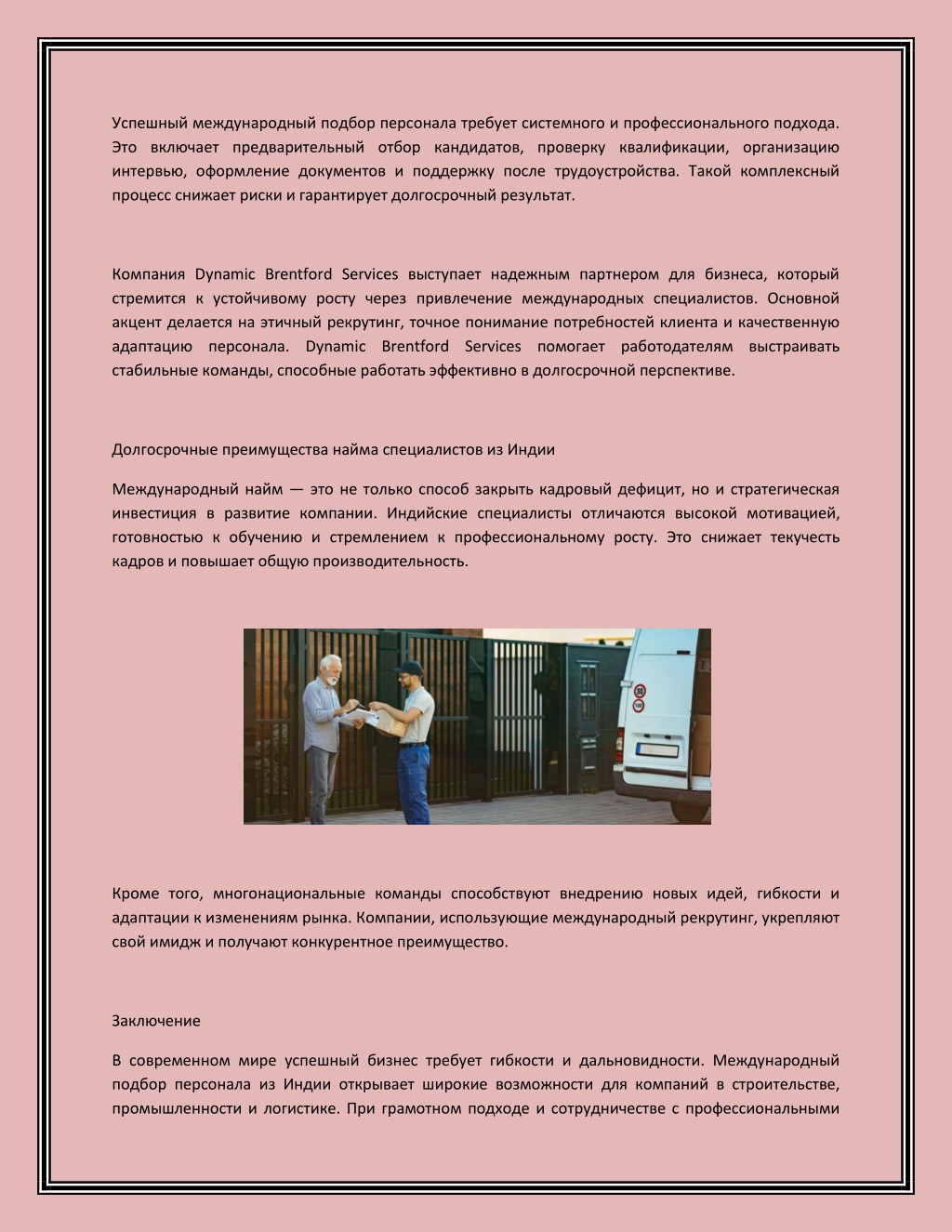 Успешный международный подбор персонала требует системного и профессионального подхода. Это включает предварительный отбор кандидатов, проверку квалификации, организацию интервью, оформление документов и поддержку после трудоустройства. Такой комплексный процесс снижает риски и гарантирует долгосрочный результат. Компания Dynamic Brentford Services выступает надежным партнером для бизнеса, который стремится к устойчивому росту через привлечение международных специалистов. Основной акцент делается на этичный рекрутинг, точное понимание потребностей клиента и качественную адаптацию персонала. Dynamic Brentford Services помогает работодателям выстраивать стабильные команды, способные работать эффективно в долгосрочной перспективе. Долгосрочные преимущества найма специалистов из Индии Международный найм —это не только способ закрыть кадровый дефицит, но и стратегическая инвестиция в развитие компании. Индийские специалисты отличаются высокой мотивацией, готовностью к обучению и стремлением к профессиональному росту. Это снижает текучесть кадров и повышает общую производительность. Кроме того, многонациональные команды способствуют внедрению новых идей, гибкости и адаптации к изменениям рынка. Компании, использующие международный рекрутинг, укрепляют свой имидж и получают конкурентное преимущество. Заключение В современном мире успешный бизнес требует гибкости и дальновидности. Международный подбор персонала из Индии открывает широкие возможности для компаний в строительстве, промышленности и логистике. При грамотном подходе и сотрудничестве с профессиональными