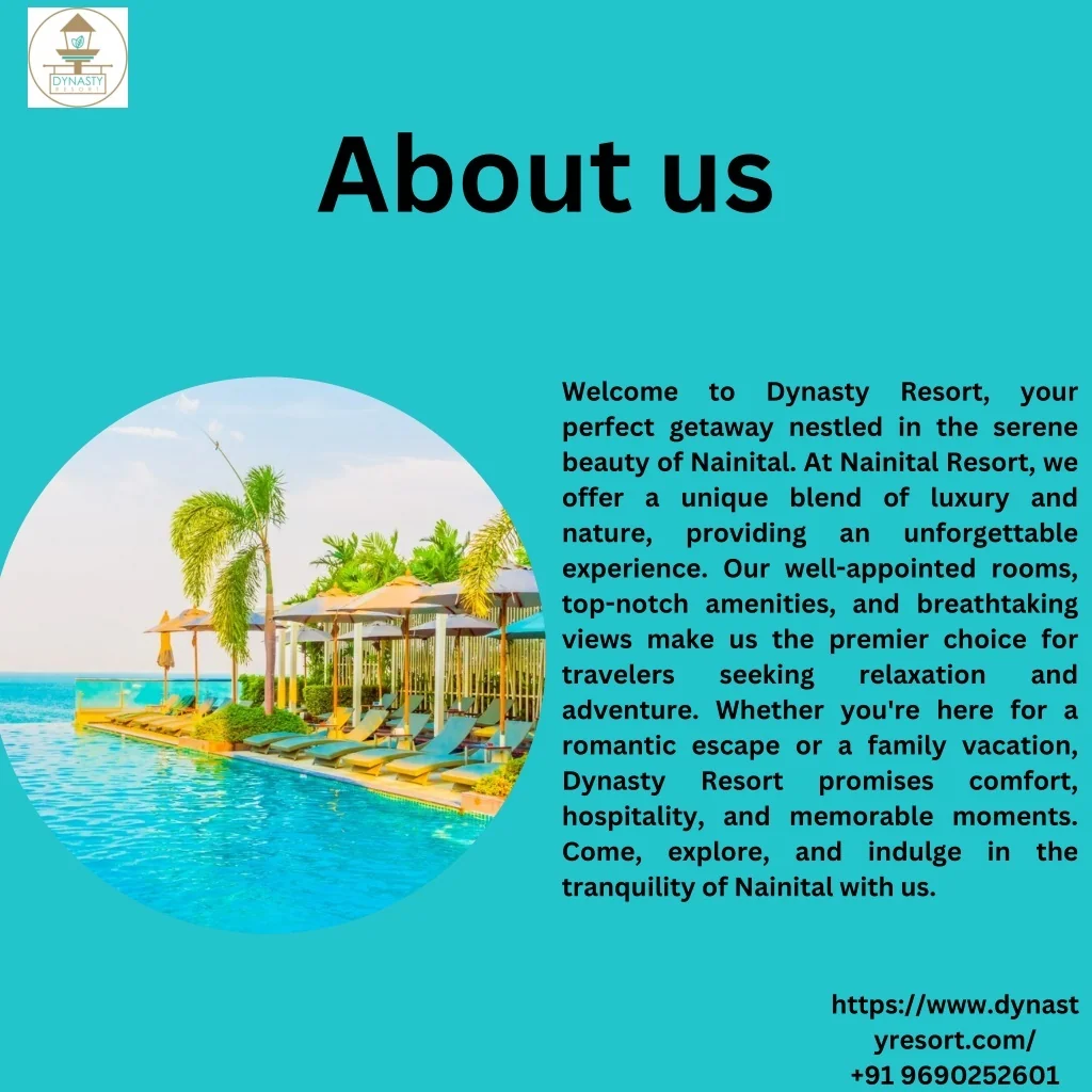 About us Welcome perfect getaway nestled in the serene beauty of Nainital. At Nainital Resort, we offer a unique blend of luxury and nature, providing experience. Our well-appointed rooms, top-notch amenities, and breathtaking views make us the premier choice for travelers seeking adventure. Whether you're here for a romantic escape or a family vacation, Dynasty Resort promises hospitality, and memorable moments. Come, explore, and indulge in the tranquility of Nainital with us. to Dynasty Resort, your an unforgettable relaxation and comfort, https://www.dynast yresort.com/ +91 9690252601
