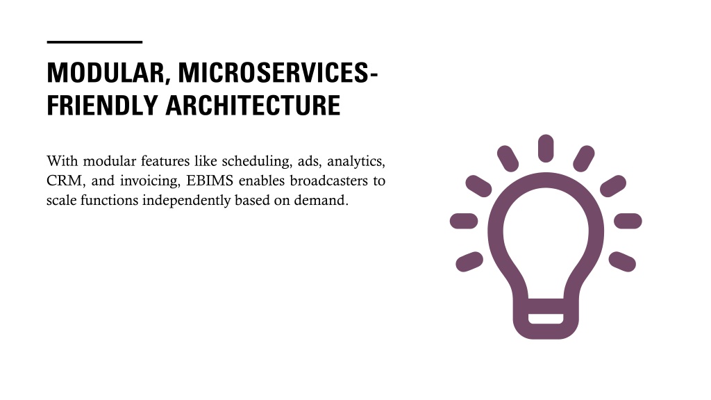 Modular, Microservices-Friendly Architecture With modular features like scheduling, ads, analytics, CRM, and invoicing, EBIMS enables broadcasters to scale functions independently based on demand.